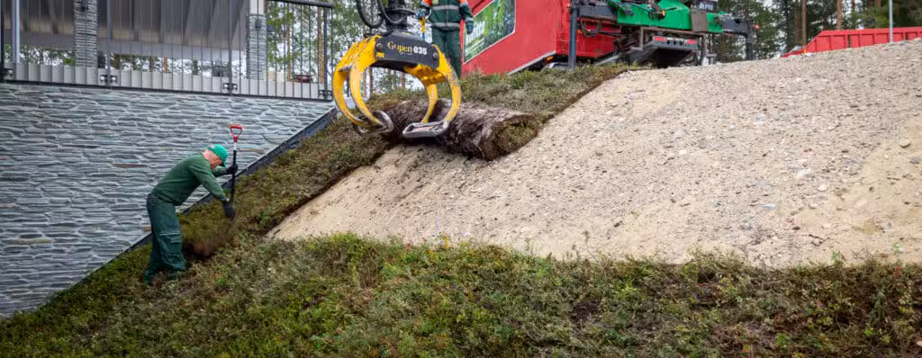 Det lönar sig att anlägga skogsmatta i så stora bitar som möjligt, eftersom då uppstår färre fogar och skogmattans rotskikt förblir i större grad sammanhängande. Detta minskar även behovet av bevattning. Vi rekommenderar att anläggningen ska utföras inom cirka 10 dagar från upptagningen, och den allmänna rekommendationen är att anlägga skogsmattan så snart som möjligt efter leveransen. Piiraisen Skogsmatta® levereras inom några dagar efter upptagningen, så det finns fortfarande gott om tid kvar av den rekommenderade anläggningstiden efter leveransen. Anläggningen behöver därför inte nödvändigtvis planeras till samma dag som leveransen, utan kan till exempel utföras följande dag.